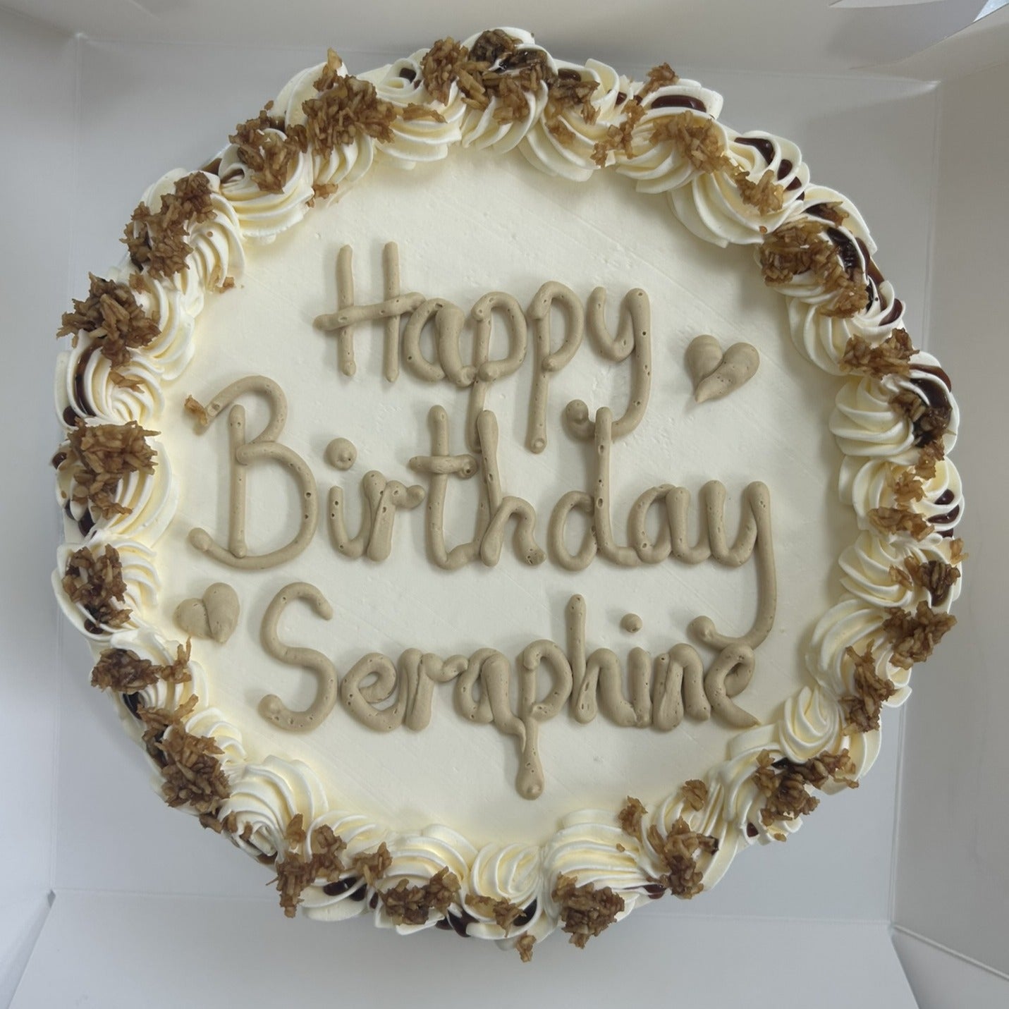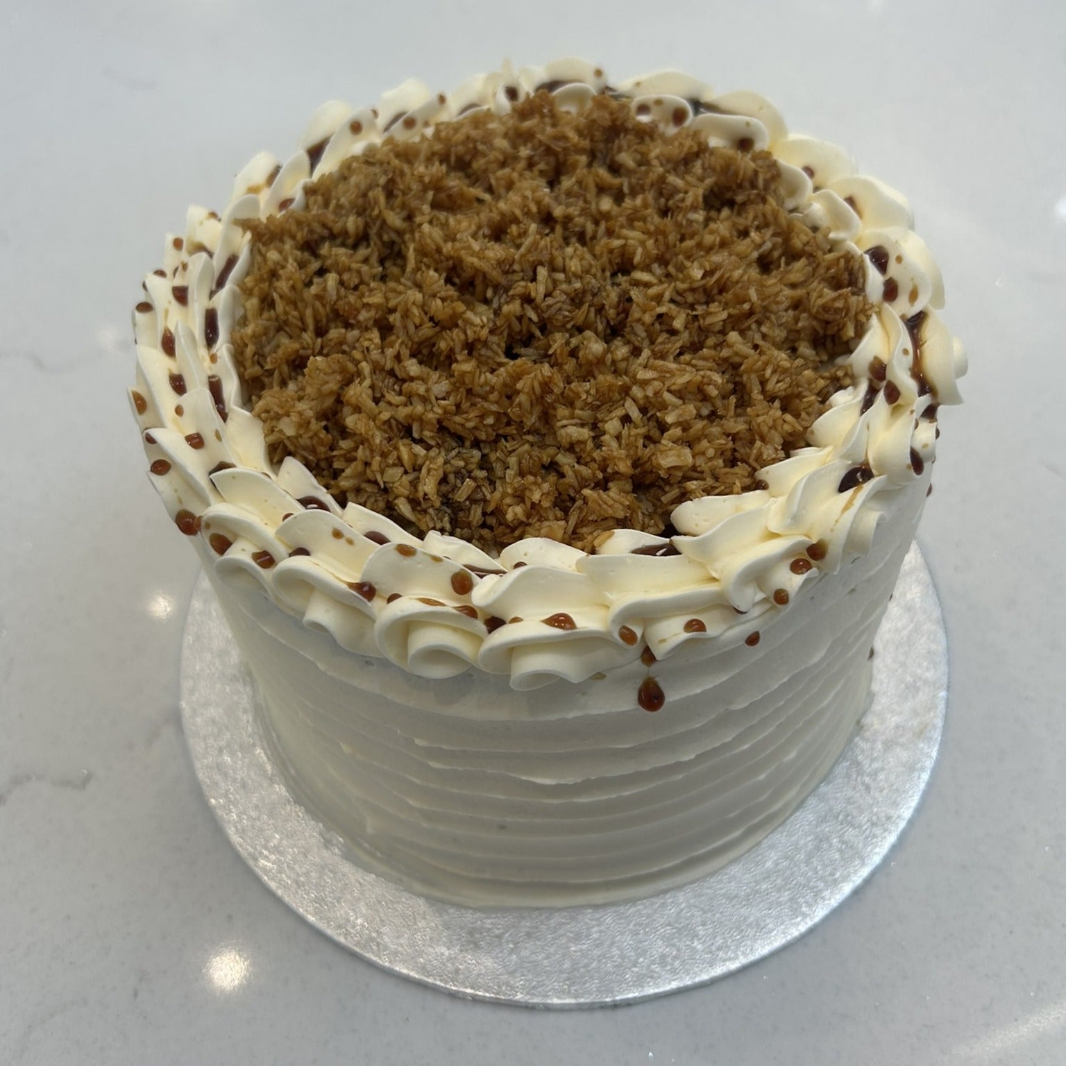 Our Onde-Onde cake consists of layers of gula melaka, desiccated coconut and pandan genoise sponge, covered in a swiss meringue buttercream.