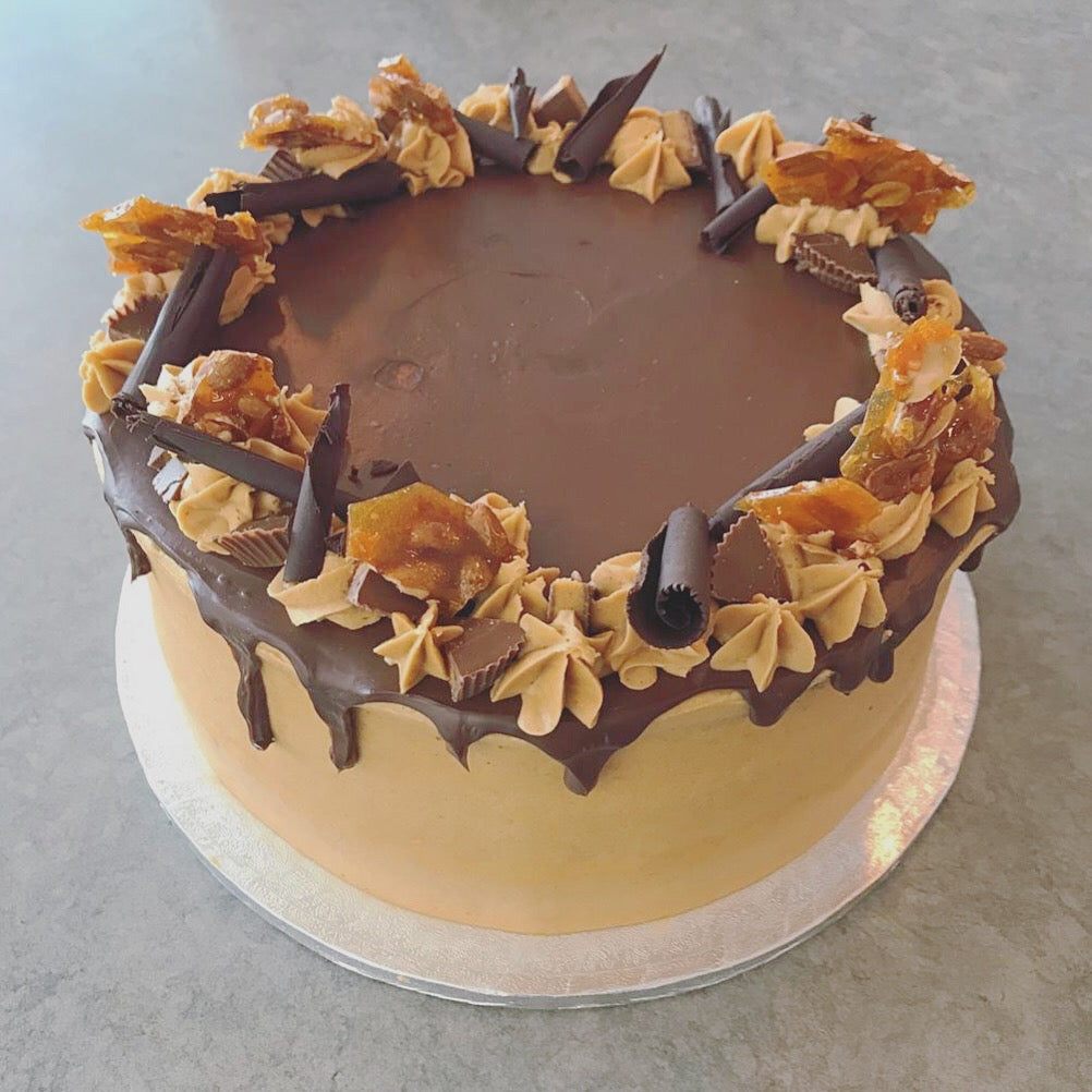 Soft, moist chocolate sponge, layered with chocolate ganache and peanut butter frosting. Finished with peanut butter frosting, chocolate drip, and Reese's Peanut Butter Cups or peanut brittle!
