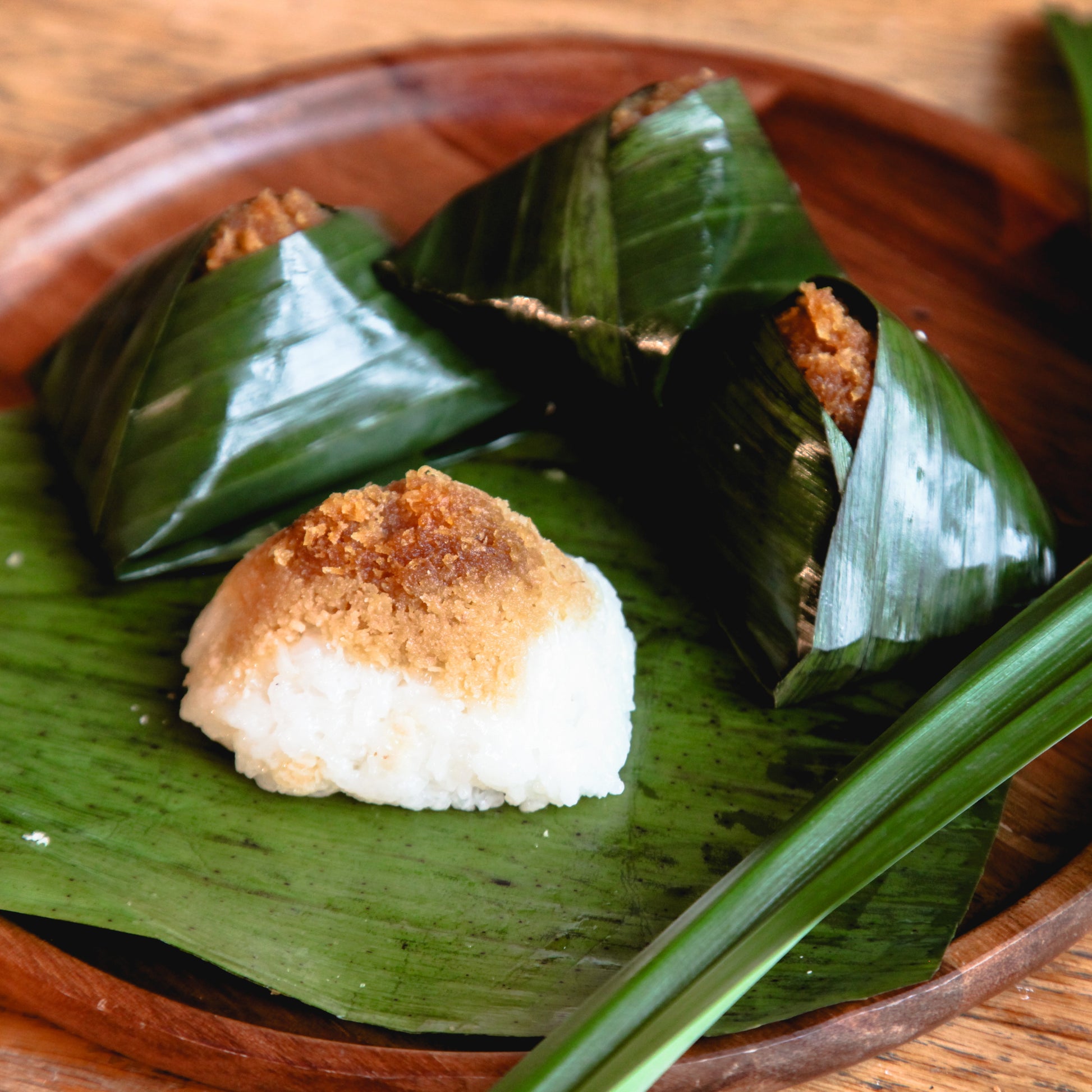Sticky, sweet parcels containing glutinous rice, fresh coconut and coconut palm sugar. These are a delicious snack or dessert, a firm favourite among coconut lovers.